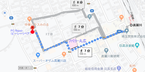 @高麗川駅前通りを直進し、ファミリー丸広さん前の交差点を右折 A1本目の十字路を左折 B2本目のT字路を右折 C栗畑から2件目がPC Repairです 圏央道狭山日高インターより15分 @狭山日高インター飯能方面出口通過後、1つ目の信号を右折 (交差点左奥にカー用品店コックピットさんがあります) A「上鹿山」交差点を右折 (T字路の突き当りです) B3つ目の信号を左折 (右手に高麗川駅があります) Cファミリー丸広さん前の交差点を右折 D1本目の十字路を左折 (信号はありません) E2本目のT字路を右折(ウェルシアさんの裏あたりです) F栗畑から2件目がPC Repairです 圏央道鶴ヶ島インターより30分 @圏央道圏央鶴ヶ島インター出口を直進し、国道407号線「圏央鶴ヶ島インター入口」交差点を左折 A県道15号線「高萩」交差点を右折 (交差点右奥に自動車販売店があります) B県道30号線「猿田」交差点を右折 (交差点左奥にセブンイレブンがあります) C2つ目の信号(押しボタン)を右折 (交差点左奥にローソンさんがあります) D中華料理店奥の通りを右折後、2件目がPC Repairです 2013年か2014年頃に区画整理があり、PC Repairの住所が変更されました。 カーナビで住所検索される方は、ナビの地図情報の年式にご注意ください。 区画整理後住所:「日高市高麗川3−11−9」 区画整理前住所:「埼玉県日高市上鹿山9−6」 PC Repair日高飯能店 |